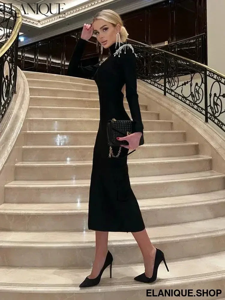 Ahagaga Fashion Hollow Out Women Maxi Dresses Sexy Solid Backless Casual Turtleneck Slim Elegant Bodycon Vestidos Robes Split - Elanique