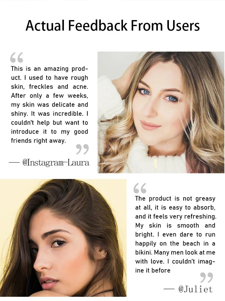 1.This is an amazing product. I used to have rough skin, freckles and acne. After only a few weeks, my skin was delicate and shiny. It was incredible. I couldn't help but want to introduce it to my good friends right away--Share from Facebook Juliet