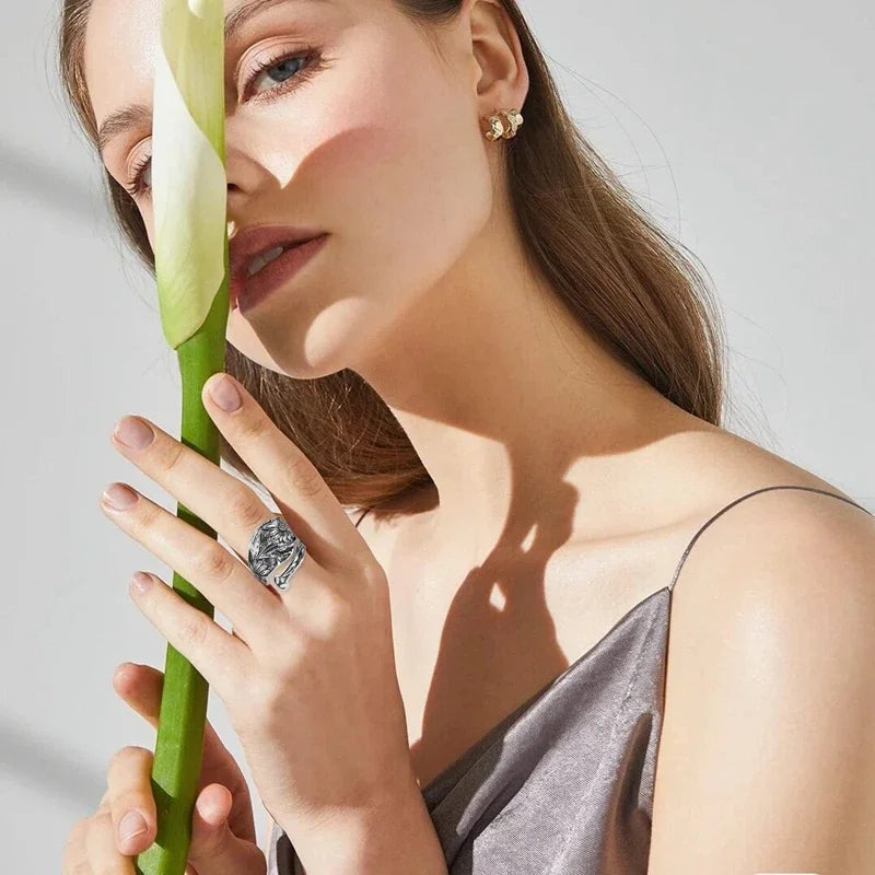 This boho engraved flower ring is a love letter to the ancient and the wild — intricate floral motifs etched into metal with the kind of detail that rewards a second look. Inspired by vintage craftsmanship, it carries the energy of something found in a faraway market, worn by a woman who collects stories as much as she collects jewellery.