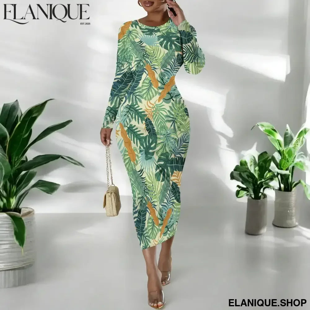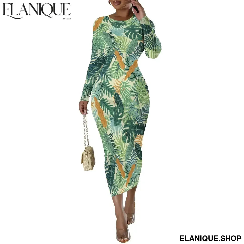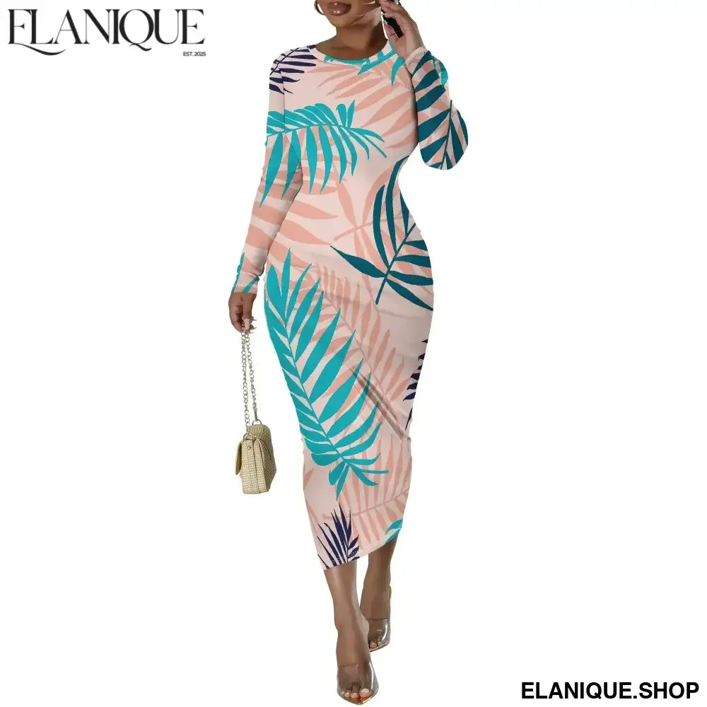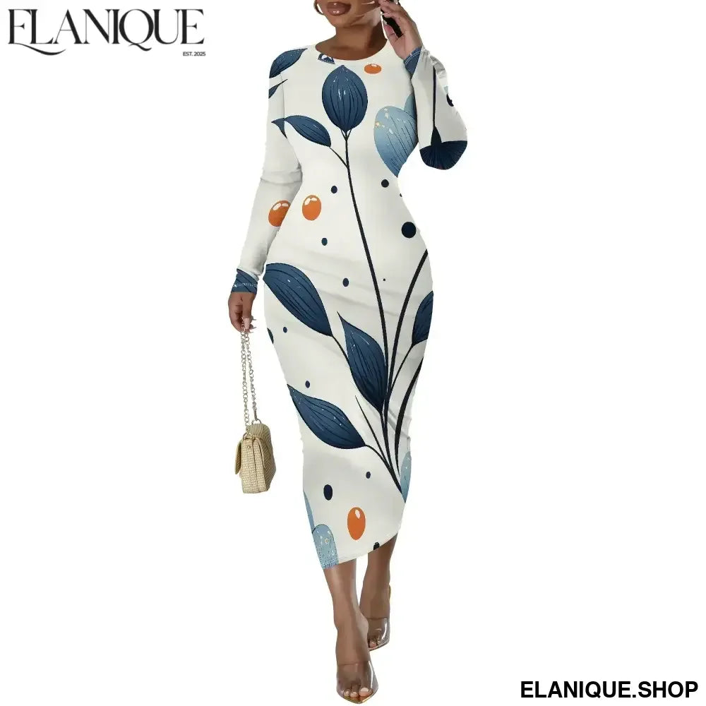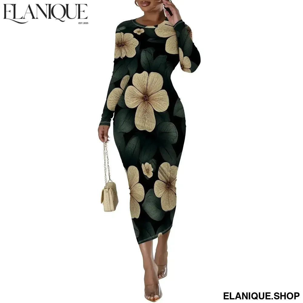 Date Night Dresses for Women Floral Print Crewneck Long Sleeve Stretchy Fitted Bodycon Maxi Dress - Elanique