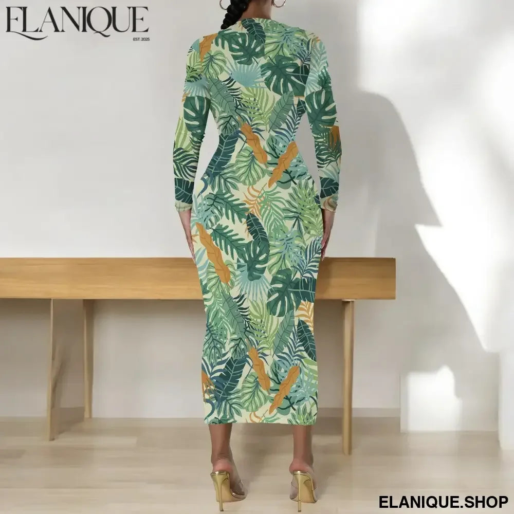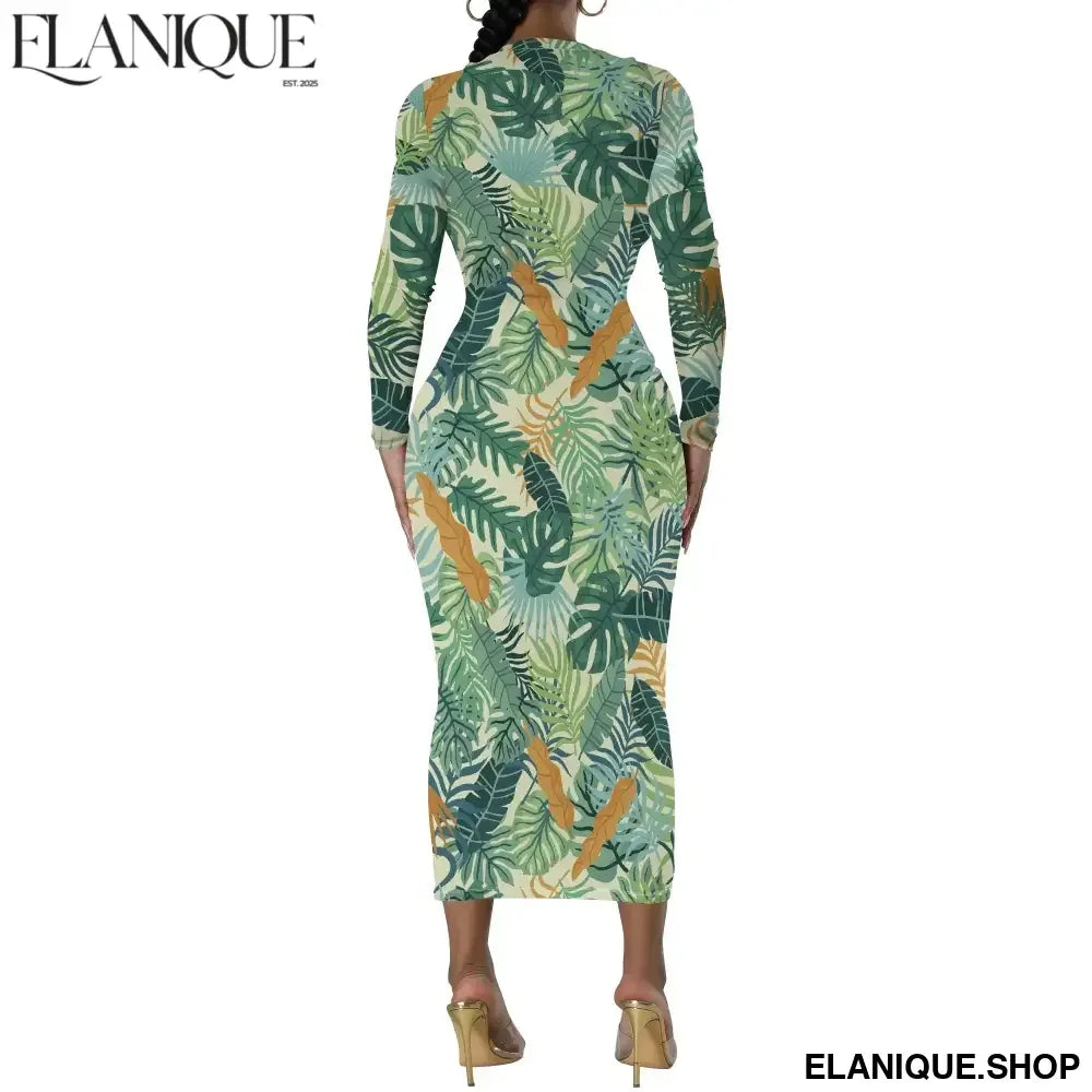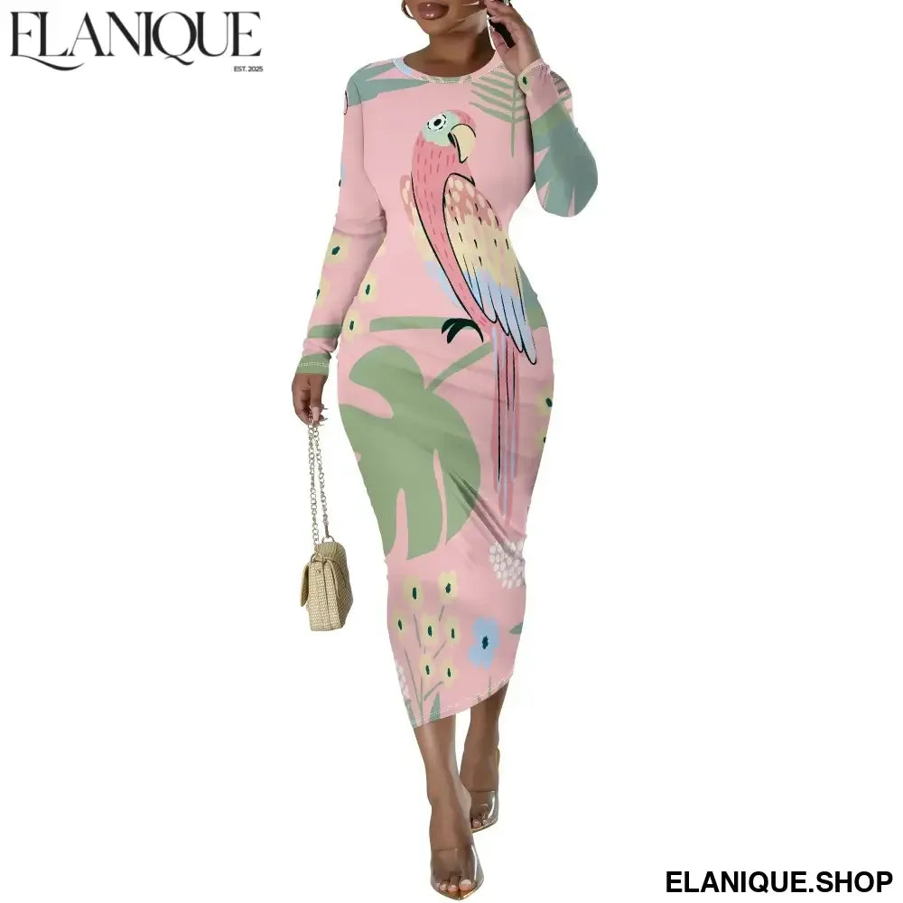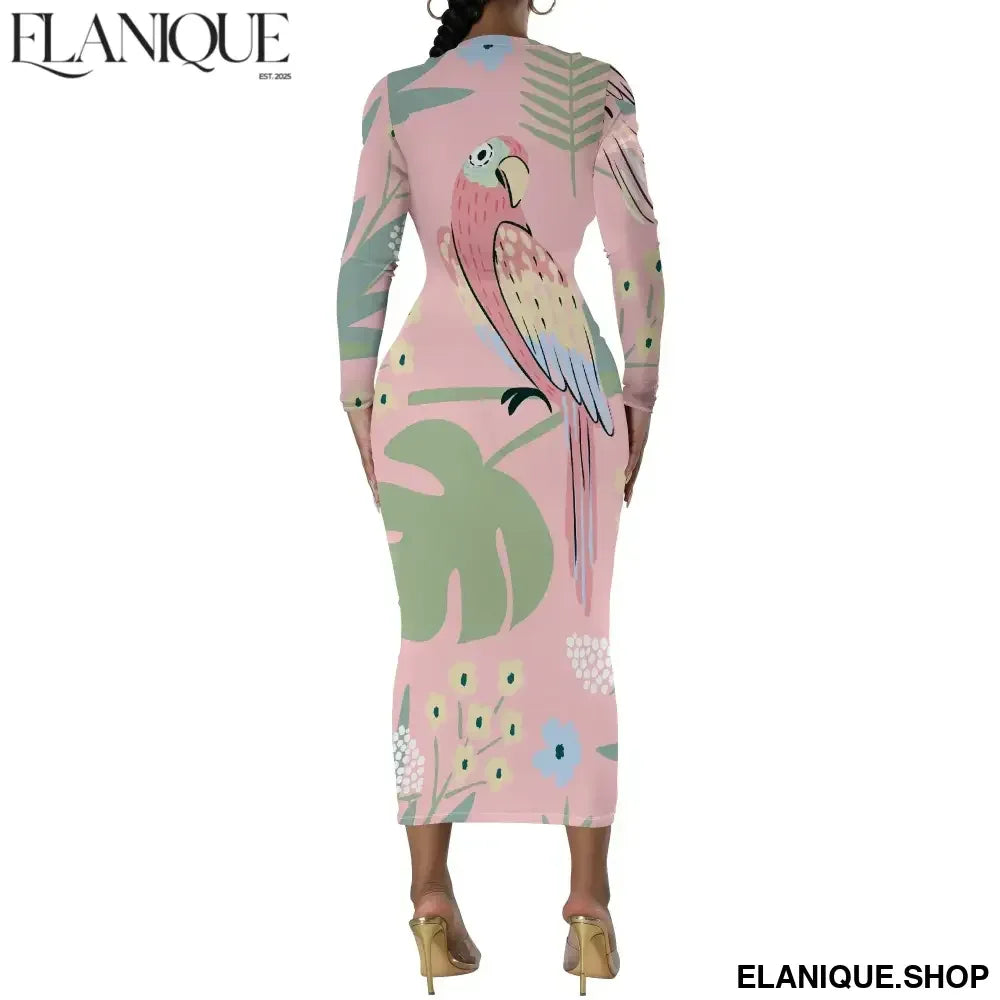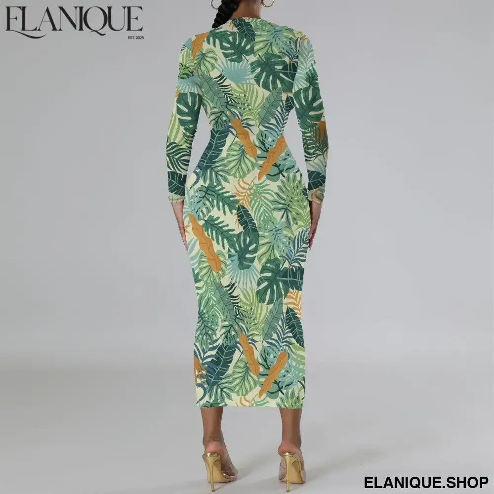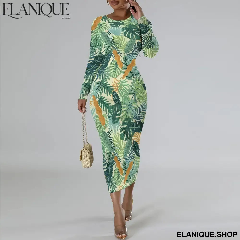 Date Night Dresses for Women Floral Print Crewneck Long Sleeve Stretchy Fitted Bodycon Maxi Dress - Elanique