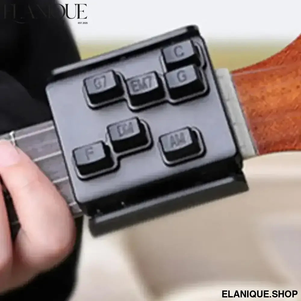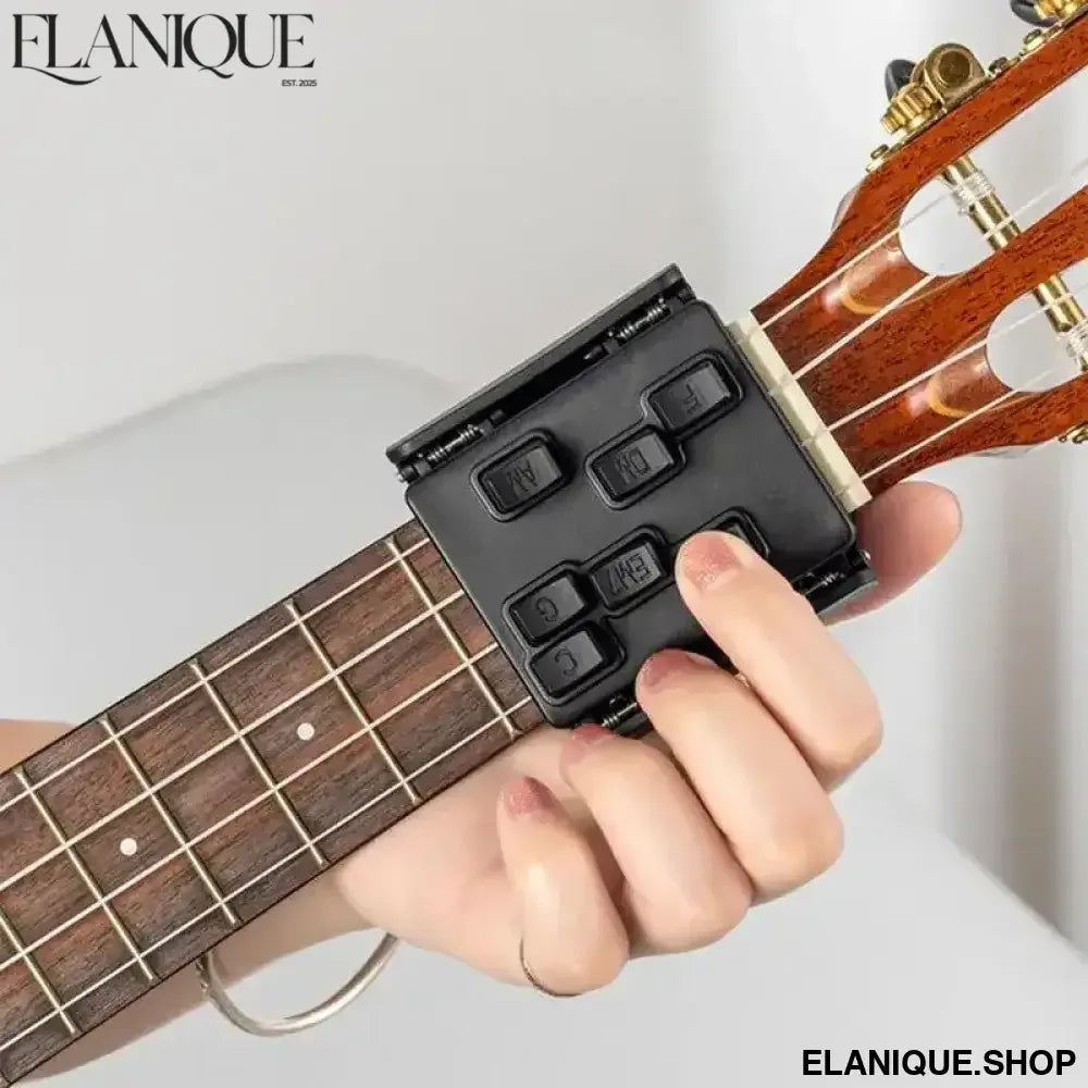 This ukulele chord presser attachment clips onto your ukulele neck and presses chord shapes cleanly, letting beginners focus on strumming and rhythm while the tool handles the fretting. It's the fastest way to start playing real songs on the ukulele — removing the finger soreness and chord buzzing that slow most beginners down in the early stages.