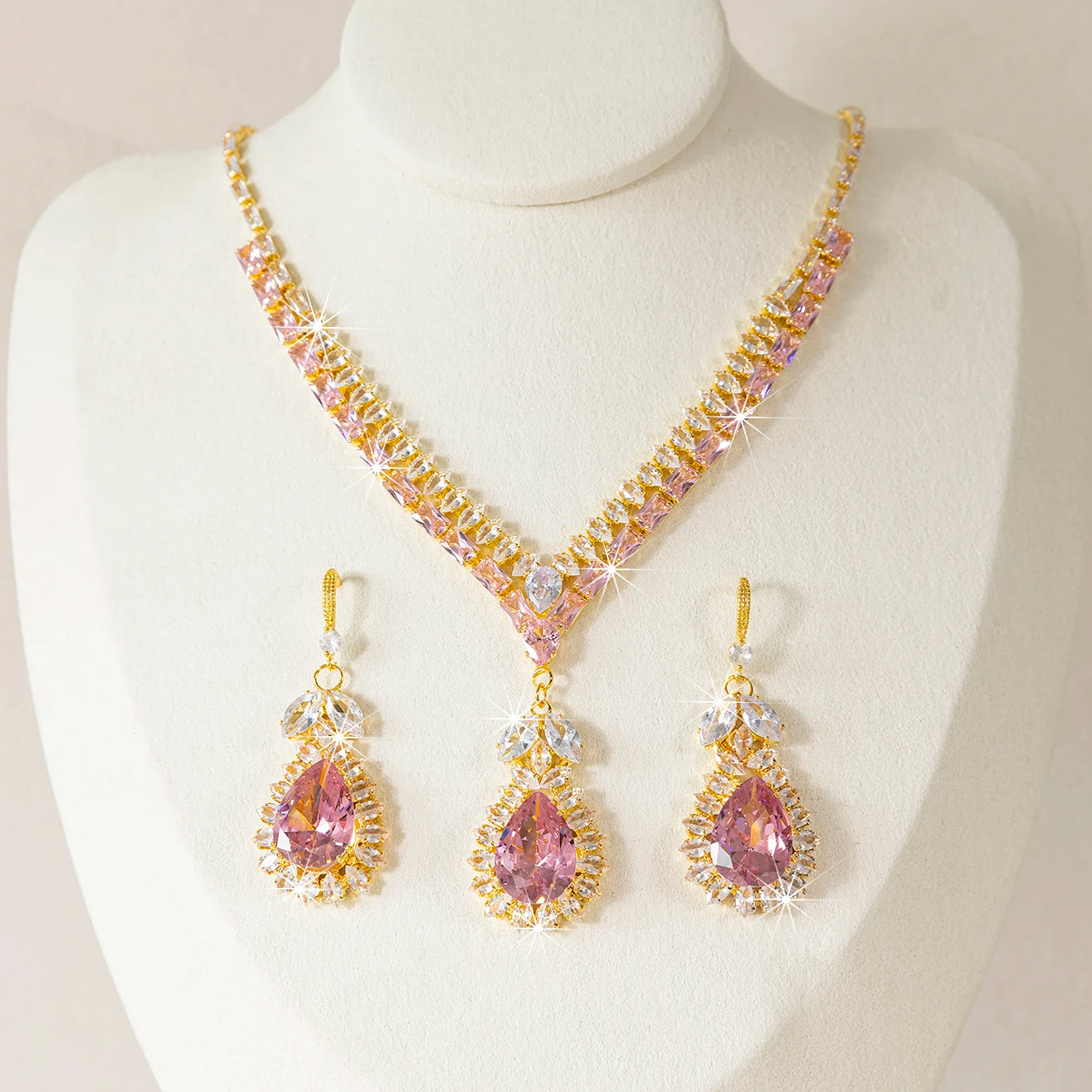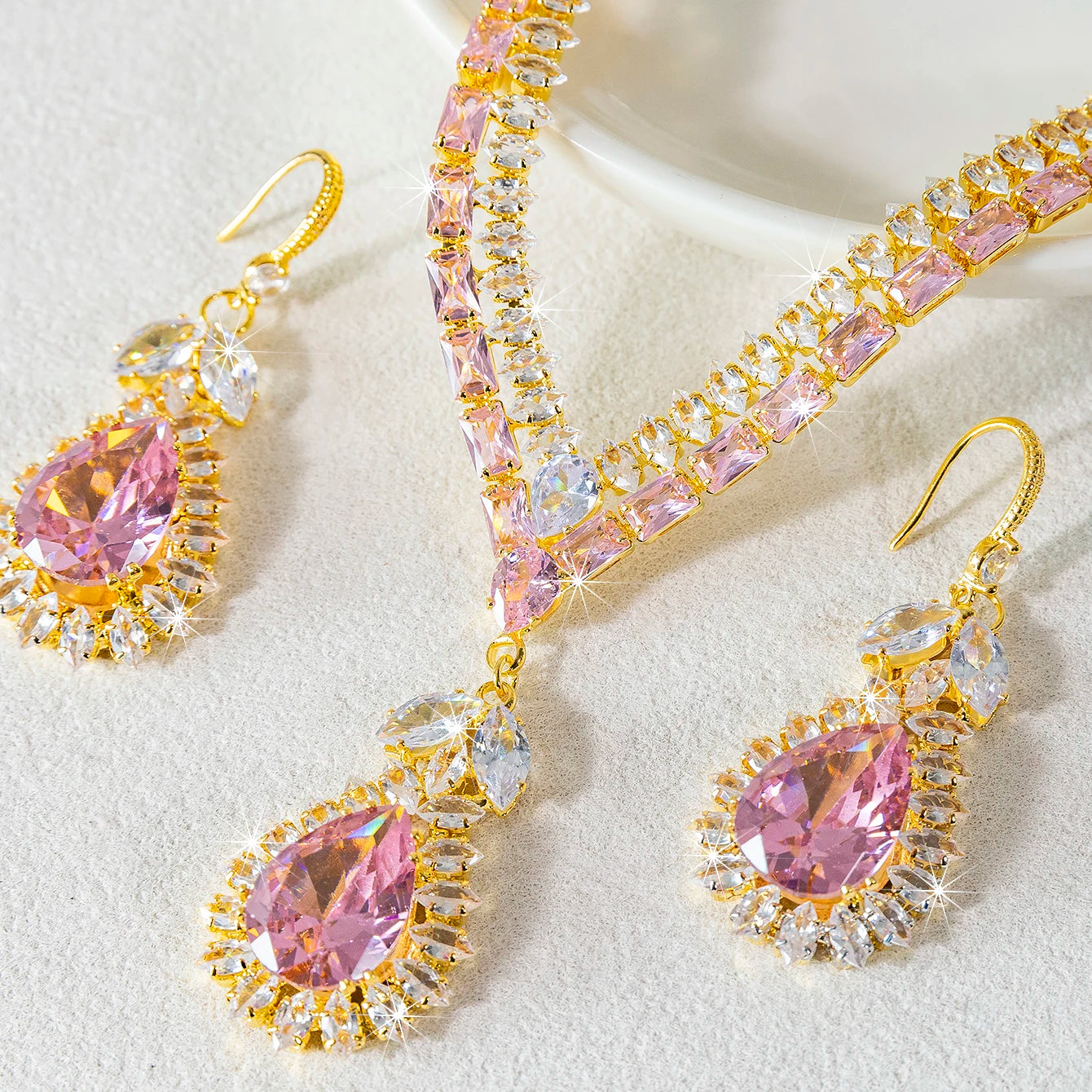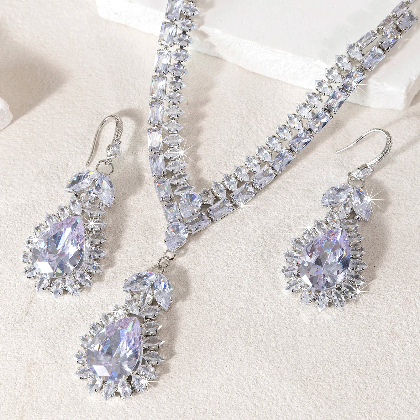 Each piece features a teardrop water droplet motif set with sparkling stones that catch and scatter light with every movement. Versatile enough for daily wear, stunning enough for weddings, banquets, and evening parties — this set is the one you reach for when you want to feel your most beautiful.