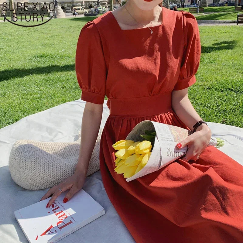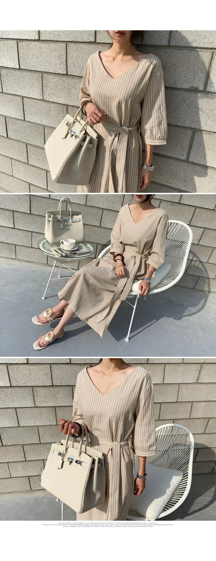 2021 Summer Striped Cotton Linen Long Dress Women Fashion Loose Vestidos Vintage V-neck Half Sleeve Dress for Women Loose