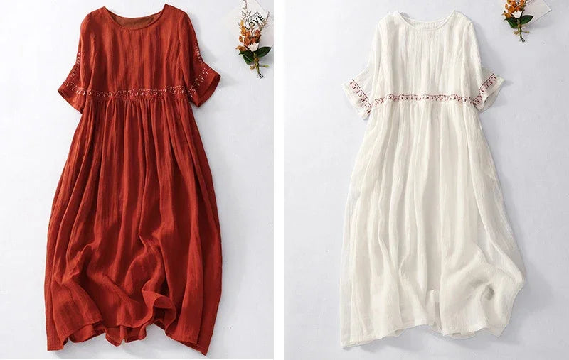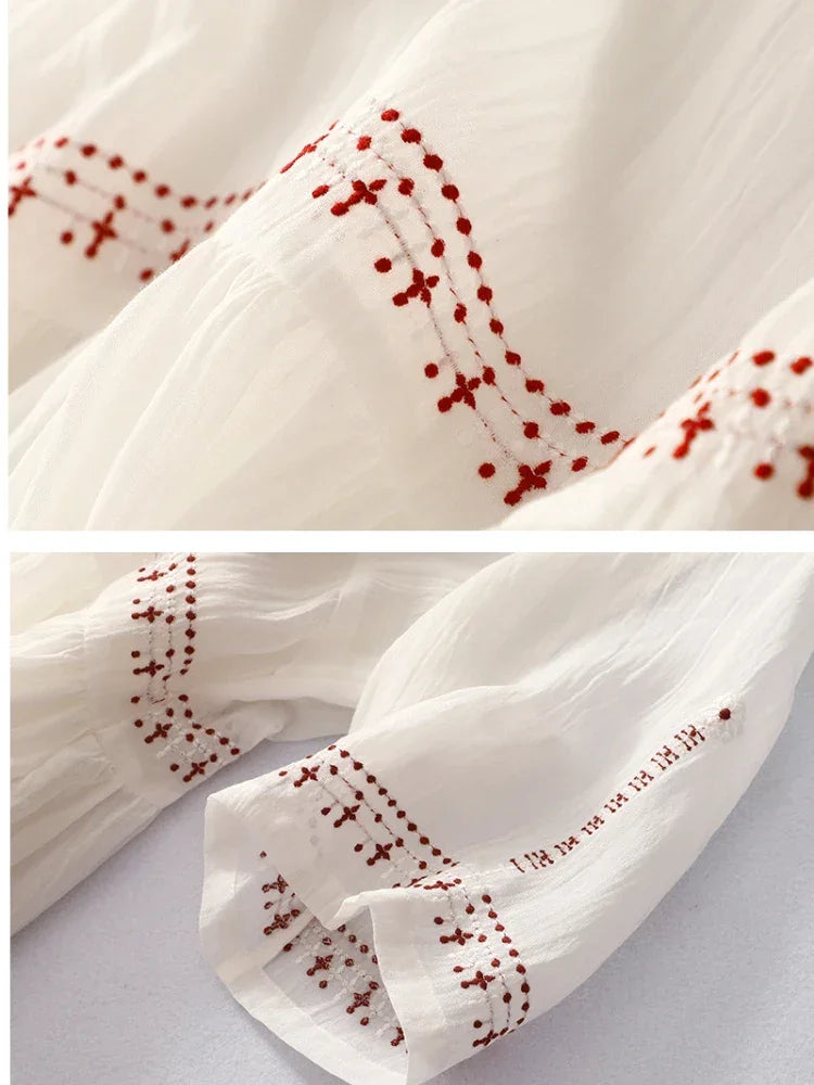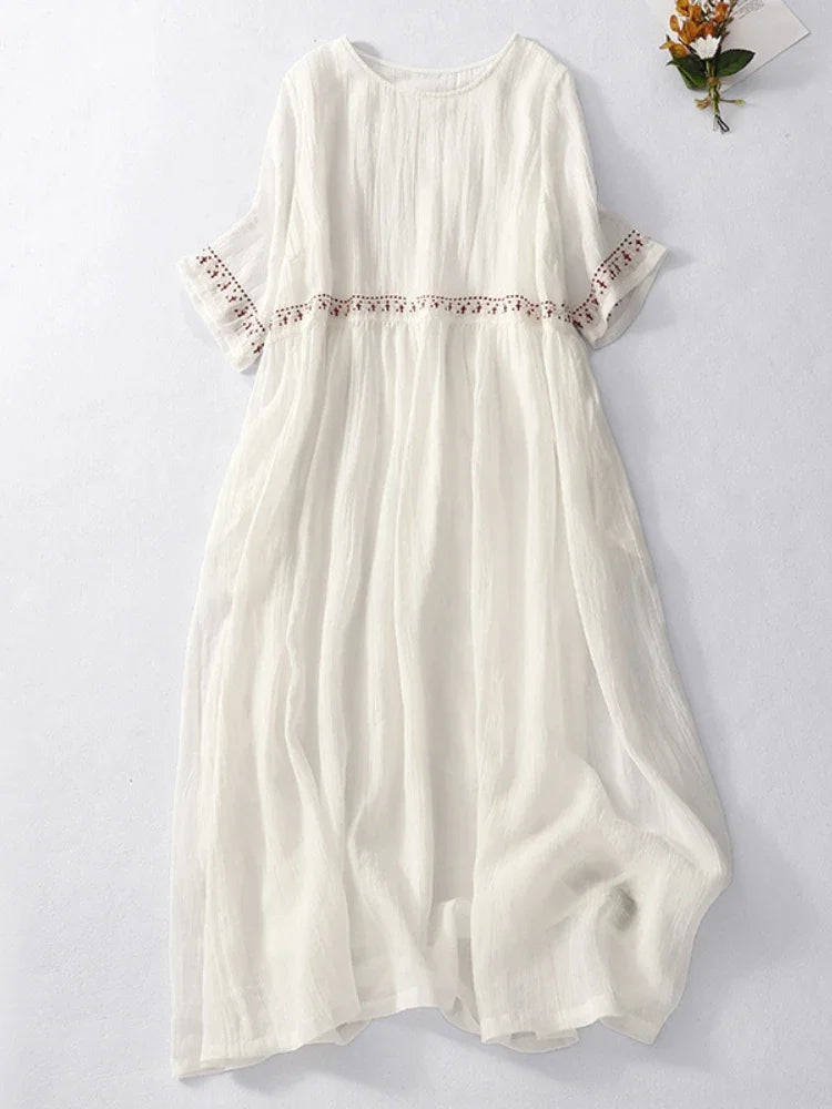 Summer New Dresses for Women LOOSE Embroidery Vintage Dress Streetwear Long Dresses Women Clothing Robe O-Neck White Dress