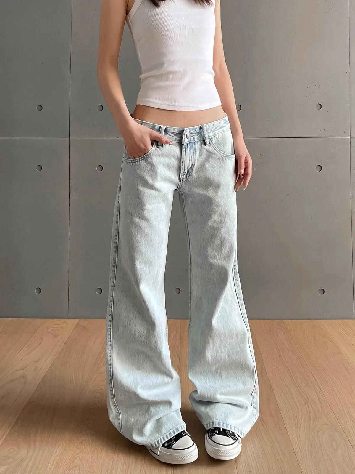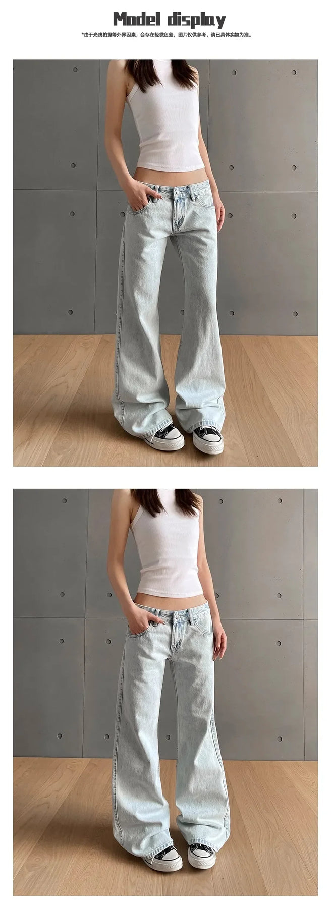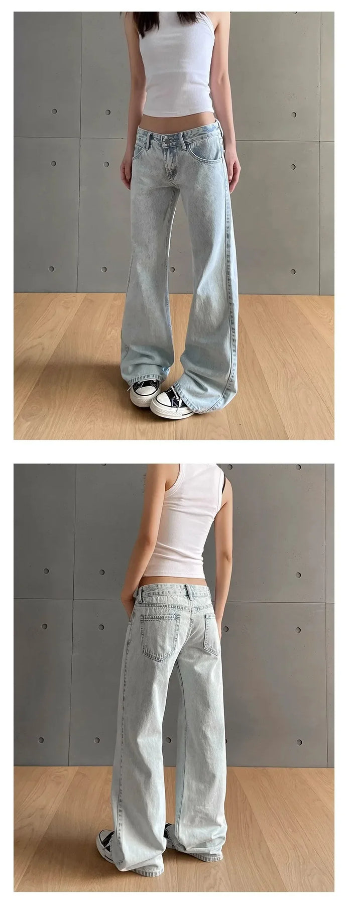 y2k Vintage Women Jeans Low Waist Zipper Button Solid Trousers with Pockets Aesthetic Streetwear Washed Jeans